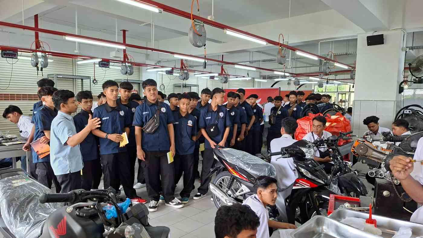 Kunjungan dilengkapi dengan peninjauan area bengkel, sehingga siswa memperoleh gambaran nyata mengenai proses perawatan sepeda motor, standar pelayanan, serta budaya kerja yang diterapkan di jaringan Honda.
